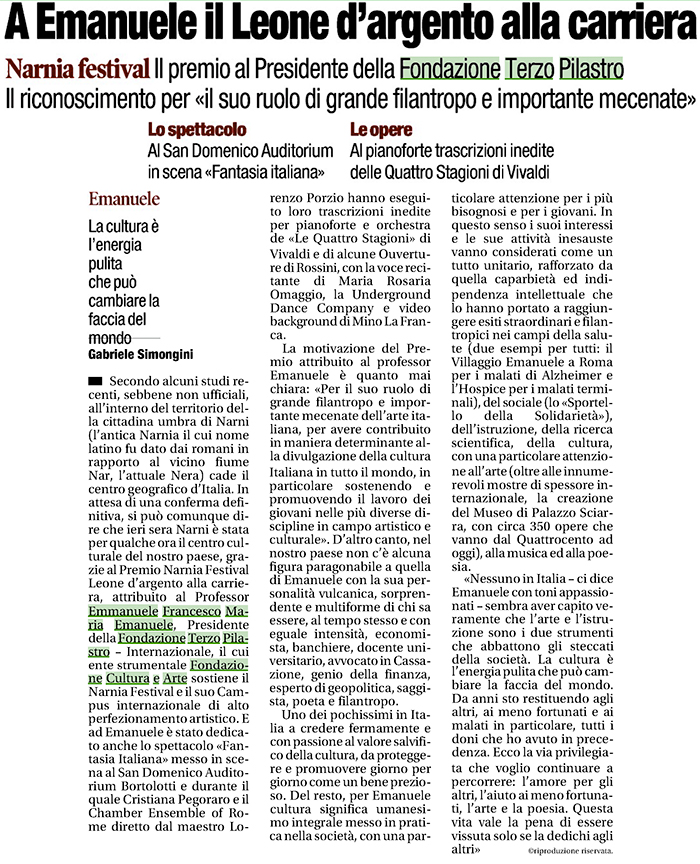 Il premio al Presidente della Fondazione Terzo Pilastro. Il riconoscimento per «il suo ruolo di grande filantropo e importante mecenate»