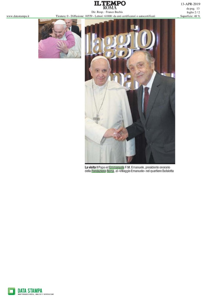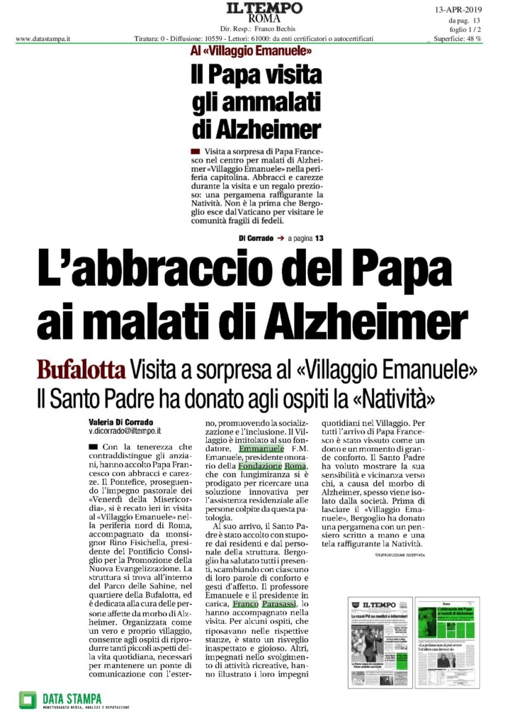 Visita a sorpresa di Papa Francesco nel centro per malati di Alzheimer «Villaggio Fondazione Roma» nella periferia capitolina. Abbracci e carezze durente la visita e un regalo prezioso: una pergamena raffigurante la Natività. Non la prima che Bergoglo esce dal Vaticano per visitare le comunità fragili di fedeli.