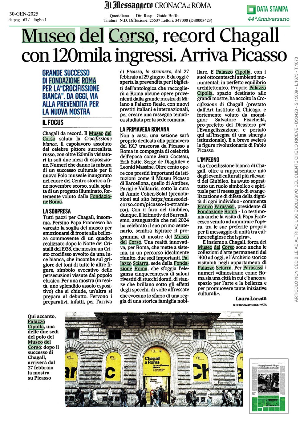 Chagall da record. Il Museo del Corso saluta la Crocifissione bianca, il capolavoro assoluto del celebre pittore surrealista russo, con oltre 120mila visitatori in soli due mesi di esposizione. Numeri che danno la misura di un successo culturale per il nuovo Polo museale inaugurato nel cuore del Centro storico a fine novembre scorso, sulla spinta di un progetto illuminato, fortemente voluto dalla Fondazione Roma.