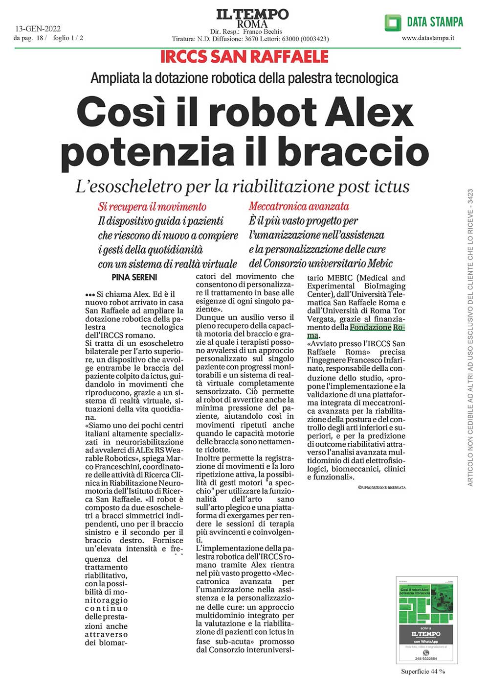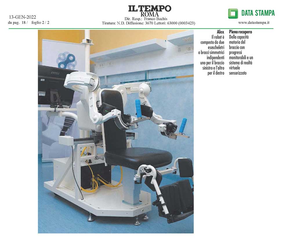 Si chiama Alex. Ed è il nuovo robot arrivato in casa San Raffaele ad ampliare la dotazione robotica della palestra tecnologica dell’IRCCS romano. Si tratta di un esoscheletro bilaterale per l’arto superiore, un dispositivo che avvolge entrambe le braccia del paziente colpito da ictus, guidandolo in movimenti che riproducono, grazie a un sistema di realtà virtuale, situazioni della vita quotidiana.
