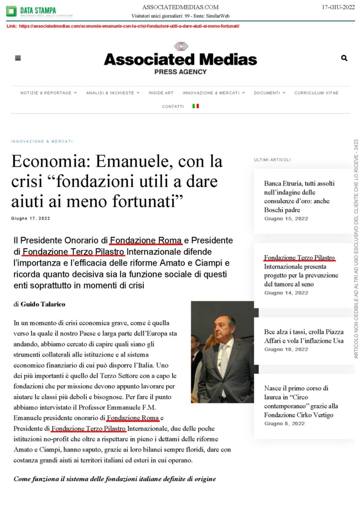 Economia: Emanuele, con la crisi “fondazioni utili a dare aiuti ai meno fortunati”