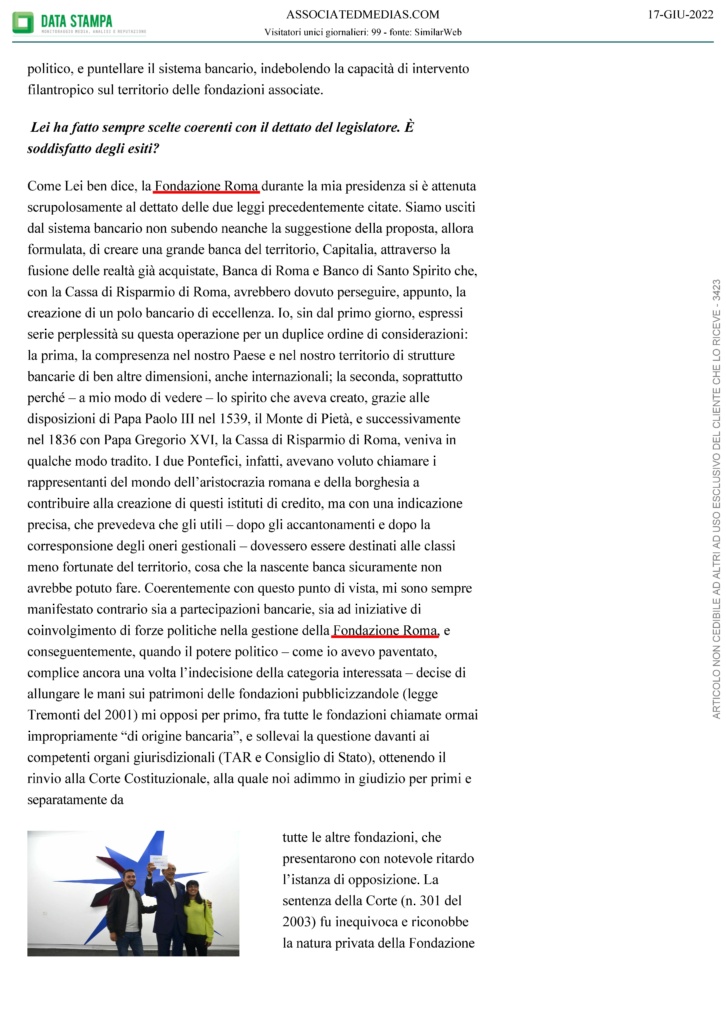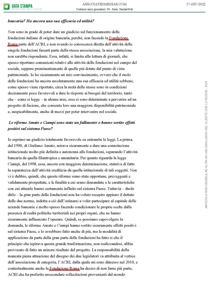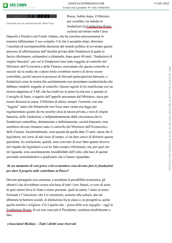 Il Presidente Onorario di Fondazione Roma e Presidente di Fondazione Terzo Pilastro Internazionale difende l’importanza e l’efficacia delle riforme Amato e Ciampi e ricorda quanto decisiva sia la funzione sociale di questi enti soprattutto in momenti di crisi