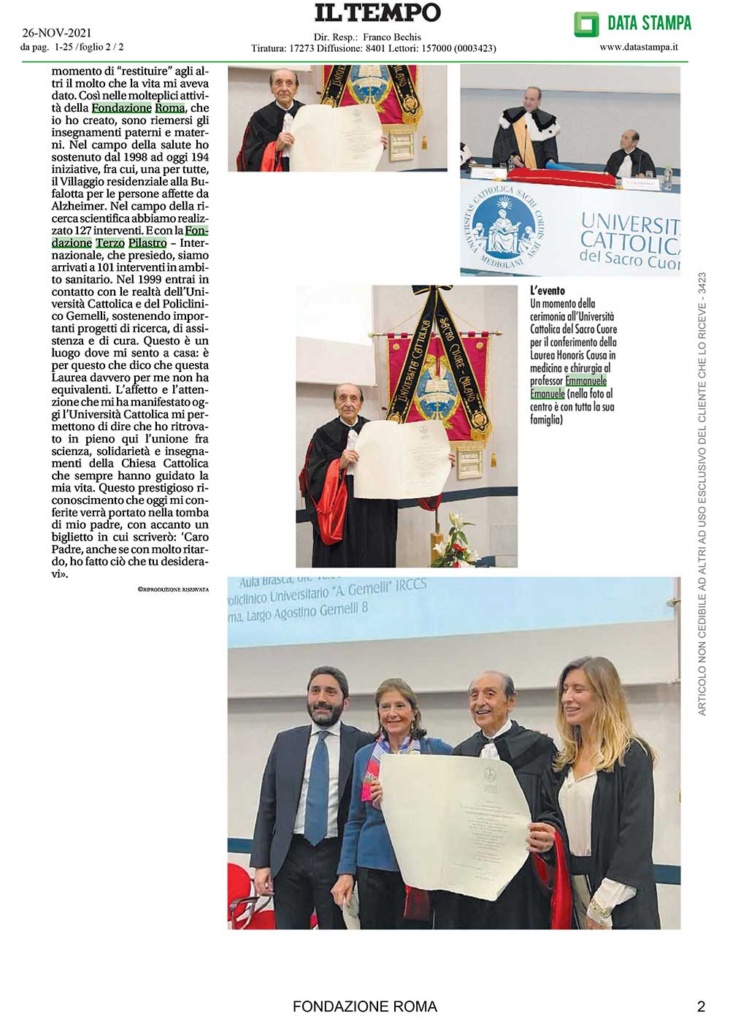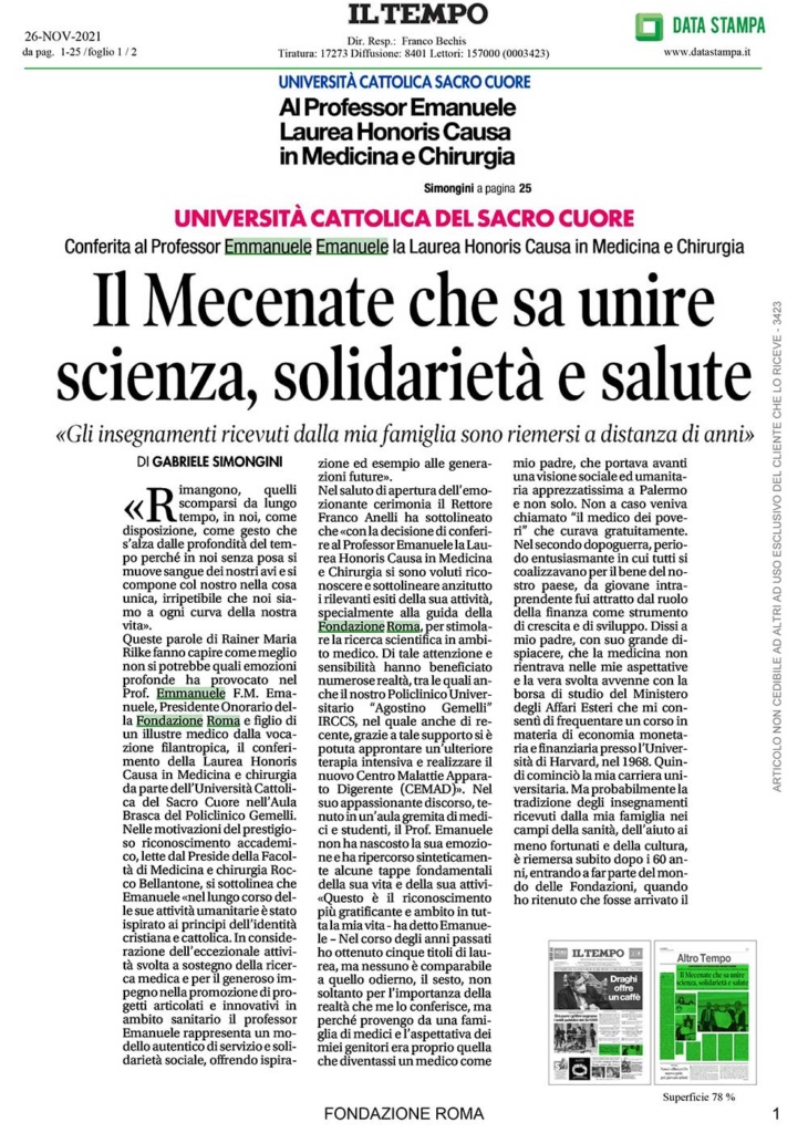 Conferita al Professor Emmanuele Emanuele la Laurea Honoris Causa in Medicina e Chirurgia. “Gli insegnamenti ricevuti dalla mia famiglia sono riemersi a distanza di anni”.